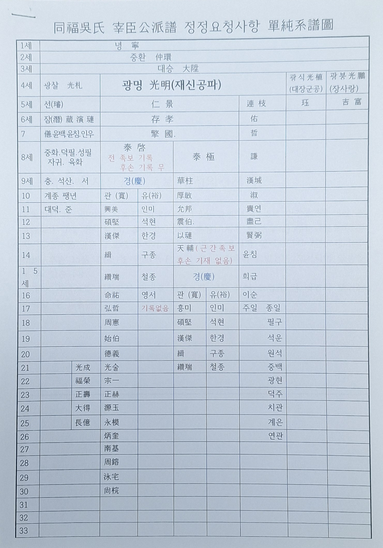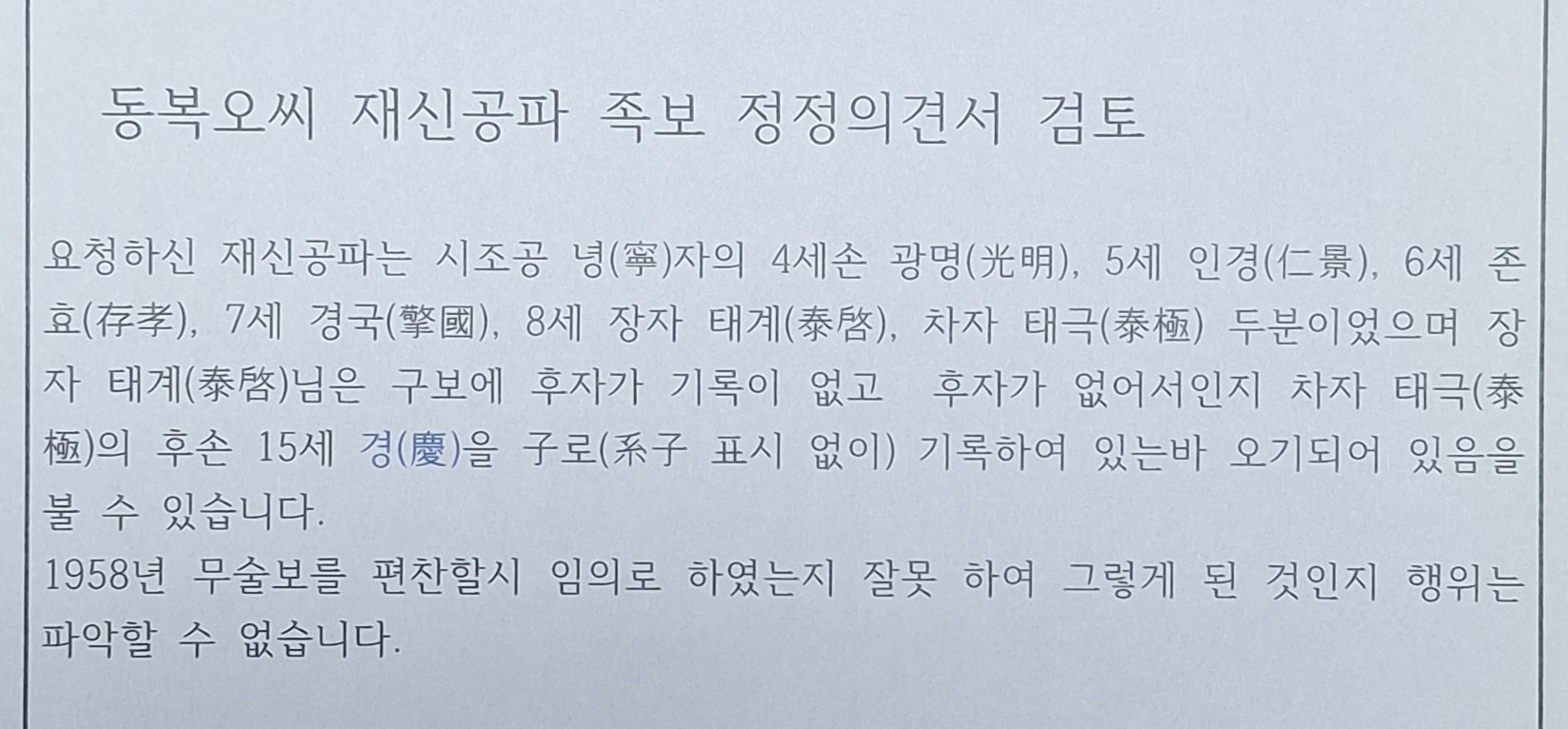 한국족보편찬위원회 홈페이지 및 전자족보 관련 방문(2021.6.7) 참석자 : 오재우 회장 대행, 오명식 편찬위원장, 오재길 홍보위원장, 오창록 재무국장, 오경탁 사무총장 5명 회의 내용 : 홈페이지 및 전자(인터넷) 족보 프로그램 변경 건 회의 결과 : 1. 홈페이지는 한국족보편찬위원회에서 직접 제작하여 대종회에서 관리하도록 도메인 및 서버 이용료를 카페24 등 회사와 계약한다. 2. 전자족보는 함양오씨대종회 사용하는 프로그램과 같게 하고 프로그램 계발자와 한국족보편찬위원회가 계약한 자료를 3차 수단 계약시에 첨부한다. 3. 홈페이지와 전자(인터넷)족보 재구축 후에 대종회와 한국족보편찬위원회가 3차 수단 계약서를 작성한다. 2021.6.7.22:07 사무총장 오경탁 올림 同福吳氏 보첩(譜牒) 誤記된 內容 修正件